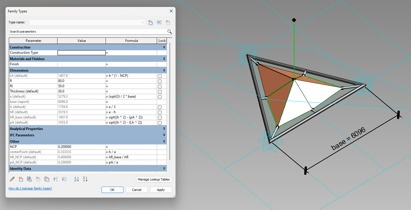 Using the Family Types dialog, I defined key dimensions, like the height, base, and length. These parameters controlled the movement of the facade.
